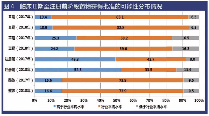 從統(tǒng)計數(shù)據(jù)來看,2018年“注冊前”藥物獲得批準的可能性高于行業(yè)平均水平的藥物比例約為52.5%,較2017年(49.3%)有所升高;臨床Ⅲ期情況則相反,2018年獲得批準的可能性高于行業(yè)平均水平的藥物比例為24.2%,較2017年(25.3%)有所下降。從臨床研究階段的整體數(shù)據(jù)看,2018年在研藥物獲批可能性的分布情況,與2017年數(shù)據(jù)基本一致。