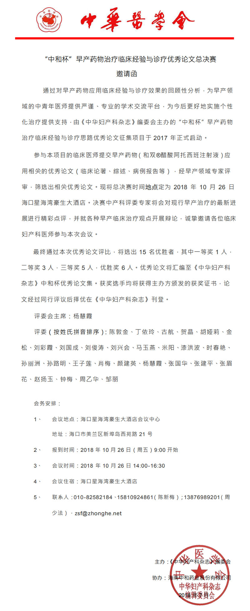 參與本項(xiàng)目的臨床醫(yī)師提交早產(chǎn)藥物(和雙?醋酸阿托西班注射液)應(yīng)用相關(guān)的優(yōu)秀論文(臨床論著、綜述、病例報(bào)告等),經(jīng)早產(chǎn)領(lǐng)域?qū)<以u(píng)審,篩選出相關(guān)優(yōu)秀論文?,F(xiàn)將總決賽時(shí)間地點(diǎn)定為 2018 年 10 月 26 日??谛呛澈郎缶频?。決賽中產(chǎn)科評(píng)委專家將會(huì)對(duì)現(xiàn)行早產(chǎn)治療的最新進(jìn)展進(jìn)行精彩點(diǎn)評(píng),并就各種早產(chǎn)臨床治療觀點(diǎn)開(kāi)展辯論,誠(chéng)摯邀請(qǐng)各位臨床婦產(chǎn)科醫(yī)師參與本次會(huì)議。