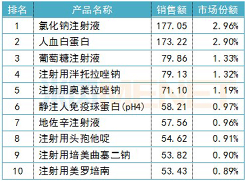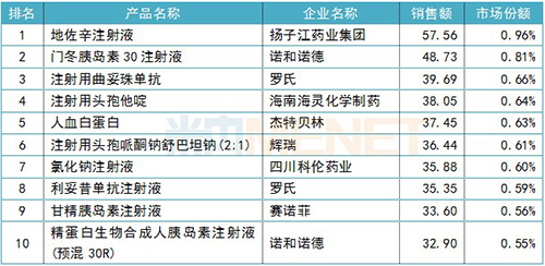 2018年中國公立醫(yī)療機(jī)構(gòu)終端化藥注射劑產(chǎn)品TOP10(單位:億元)