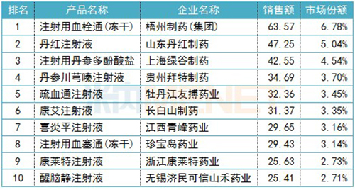 品牌TOP10銷售額均超過25億元,其中,梧州制藥(集團(tuán))的注射用血栓通(凍干)、山東丹紅制藥的丹紅注射液等7個(gè)是獨(dú)家品種。
