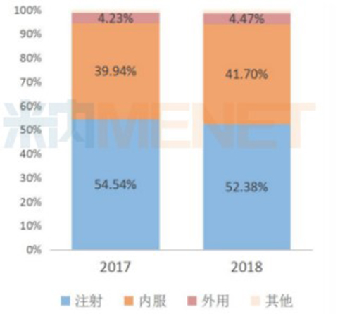 2017-2018年中國公立醫(yī)療機(jī)構(gòu)終端總體用藥途徑占比分布