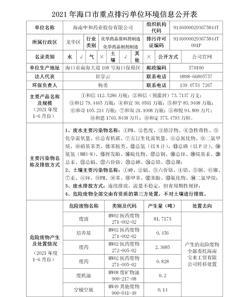 海南中和藥業(yè)--2021年海口市重點(diǎn)排污單位環(huán)境信息公開(kāi)表