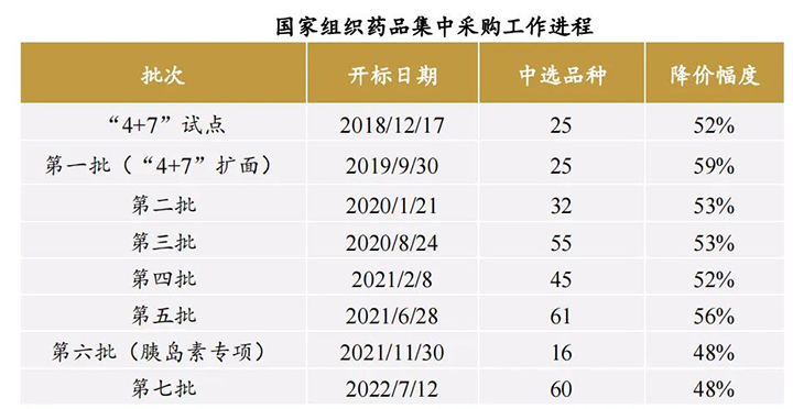 從2018年國家醫(yī)保局成立為起點(diǎn),截至 2022 年第二季度末,我國國家組織藥品集中采購已開展近5年。5年間,涉及7 批國家組織藥品集中采購,覆蓋 294 種藥品,按集采前價格測算,涉及金額約占公立醫(yī)療機(jī)構(gòu)化學(xué)藥、生物藥年采購額的 35%,一大批常見藥、慢病藥、抗癌藥價格大幅降低,平均降幅 53%。