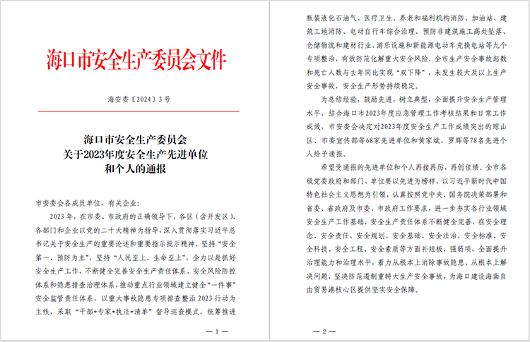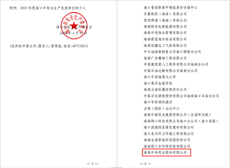 近日,??谑邪踩a(chǎn)委員會(huì)印發(fā)《??谑邪踩a(chǎn)委員會(huì)關(guān)于2023年度安全生產(chǎn)先進(jìn)單位和個(gè)人的通報(bào)》(海安委〔2024〕3號),海南中和藥業(yè)股份有限公司獲評安全生產(chǎn)先進(jìn)單位稱號。