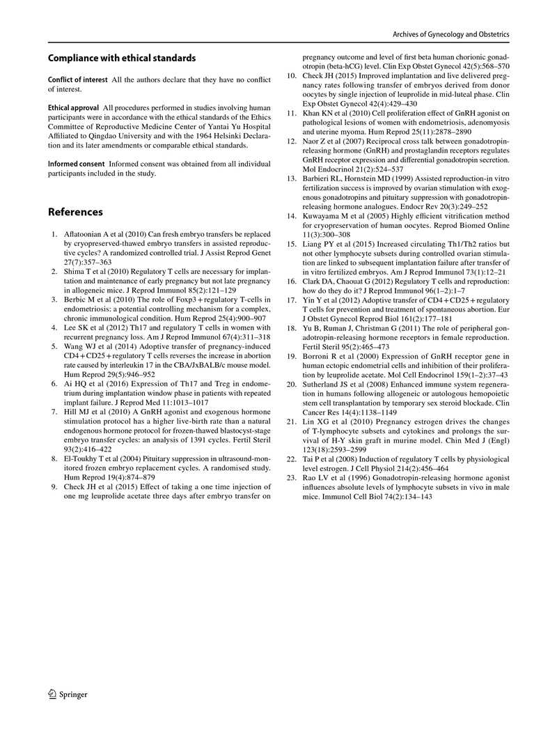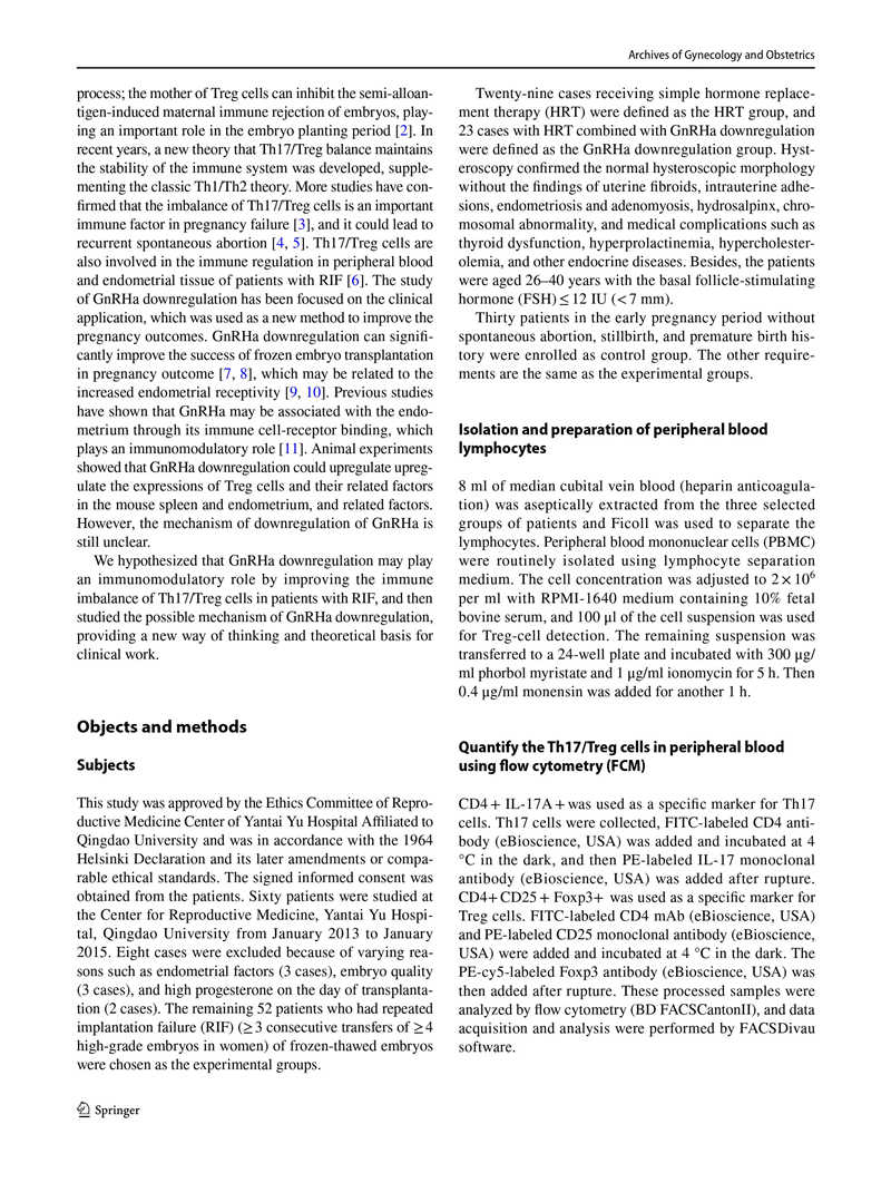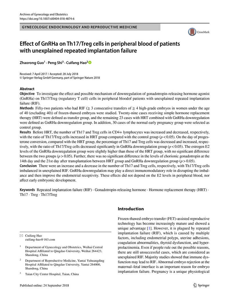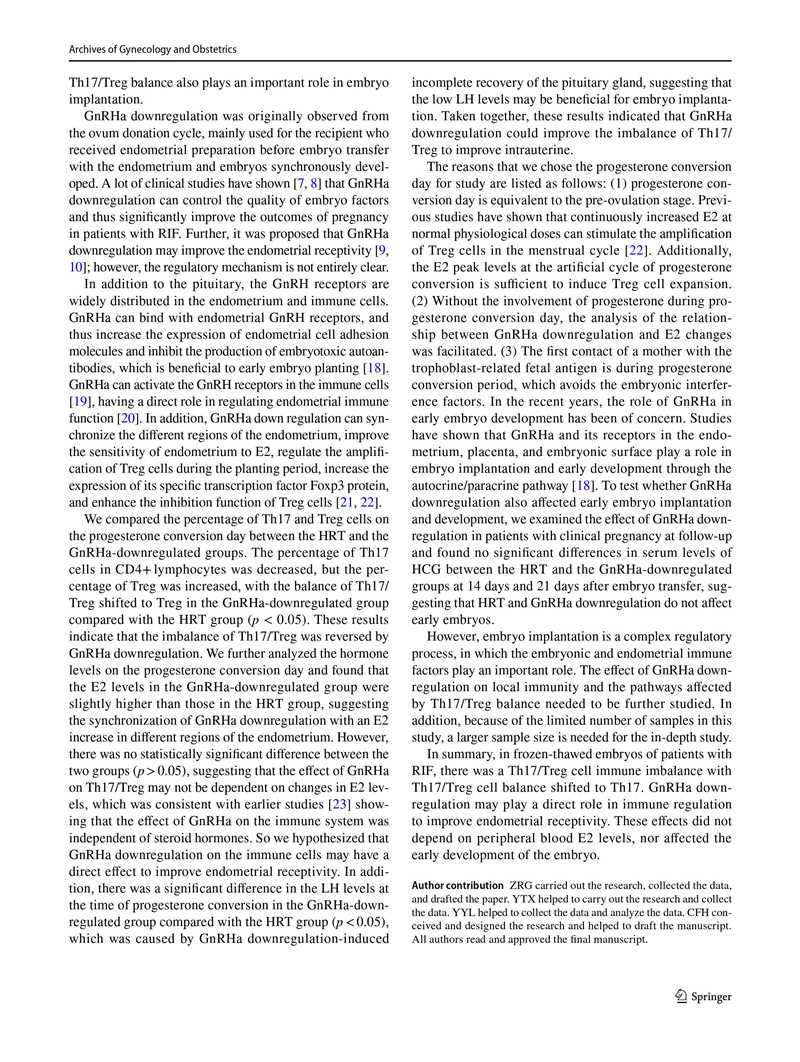結(jié)論在不明原因的RIF患者中,Th17Treg細(xì)胞數(shù)量分別增加和減少,Th17 / Treg細(xì)胞比值失衡。GnRHa降調(diào)可能通過(guò)阻斷Th17/Treg細(xì)胞比值失衡發(fā)揮免疫調(diào)節(jié)作用從而提高子宮內(nèi)膜容受性。這些作用不依賴于外周血中的E2水平,也不影響早期胚胎發(fā)育。