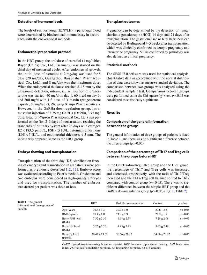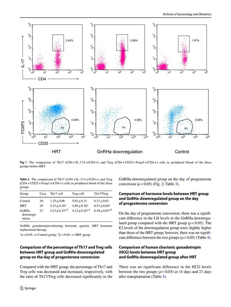 結(jié)果HRT前,HRT組與對(duì)照組相比,CD4+淋巴細(xì)胞中的Th17Treg細(xì)胞數(shù)量分別增加和減少,Th17 / Treg細(xì)胞比值升高(p<0.05)。在孕酮轉(zhuǎn)化當(dāng)天,與HRT組相比,GnRHa降調(diào)組的Th17Treg細(xì)胞百分比分別降低和升高,Th17 / Treg細(xì)胞比值顯著降低(p<0.05)。GnRHa降調(diào)組的雌激素(E2)水平略高于HRT組,兩組間差異無(wú)統(tǒng)計(jì)學(xué)意義(p> 0.05)。此外,HRT組和GnRHa降調(diào)組在移植后第14天和第21天的絨毛膜促性腺激素水平?jīng)]有顯著差異(p>0.05)。