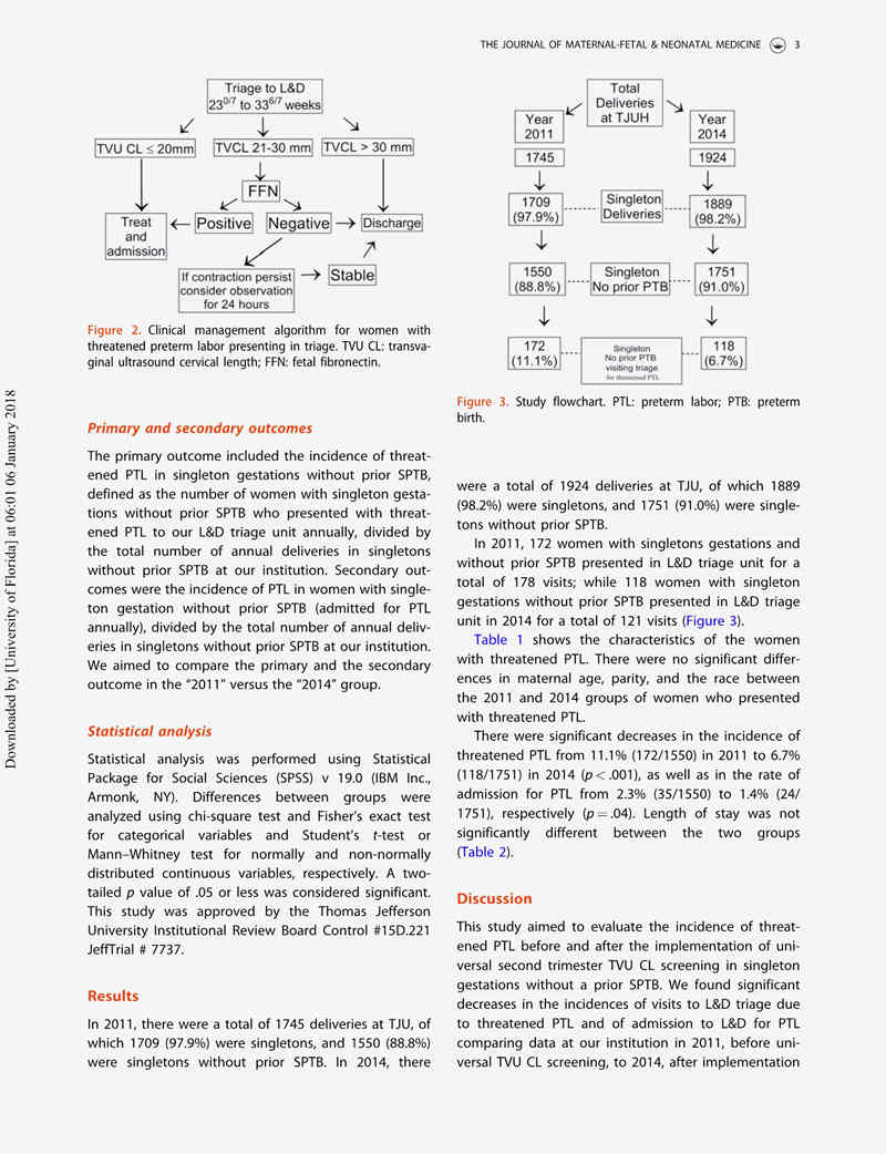 研究設(shè)計:這是一項回顧性隊列研究,研究對象是2011年(1月1日至12月31日)和2014年(1月1日至12月31日)因先兆早產(chǎn)在Thomas Jefferson大學(xué)醫(yī)院(TJU)(賓夕法尼亞州費城)就診的所有孕23 + 0/7至33 + 6/7周之間且既往無SPTB的單胎妊娠孕婦。自2012年1月1日開始起的兩年中開展TVU