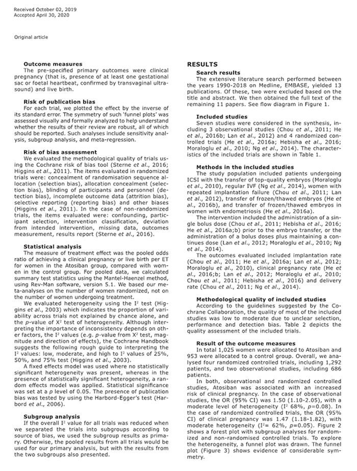方法:數(shù)據(jù)來源:使用MEDLINE和EMBASE(1990-2019)數(shù)據(jù)庫對英文文章進行系統(tǒng)回顧,檢索詞:包括阿托西班、胚胎移植。研究選擇:我們納入將阿托西班與對照組進行胚胎移植結(jié)果比較的研究。數(shù)據(jù)提?。河蓛晌蛔髡呤褂妙A(yù)定義的數(shù)據(jù)字段(包括研究質(zhì)量指標)獨立提取論文。