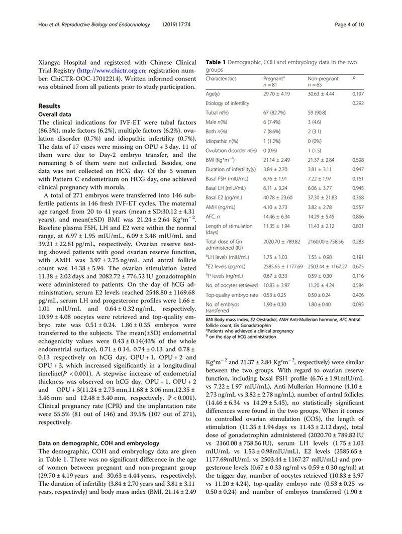 方法:在2017年8月至2018年8月,前瞻性隊列研究共招募了146名首次接受體外受精周期的不孕女性。監(jiān)測這些患者在hCG日和取卵后1-3天(OPU + 1, OPU + 2, OPU + 3)的子宮內膜回聲模式。