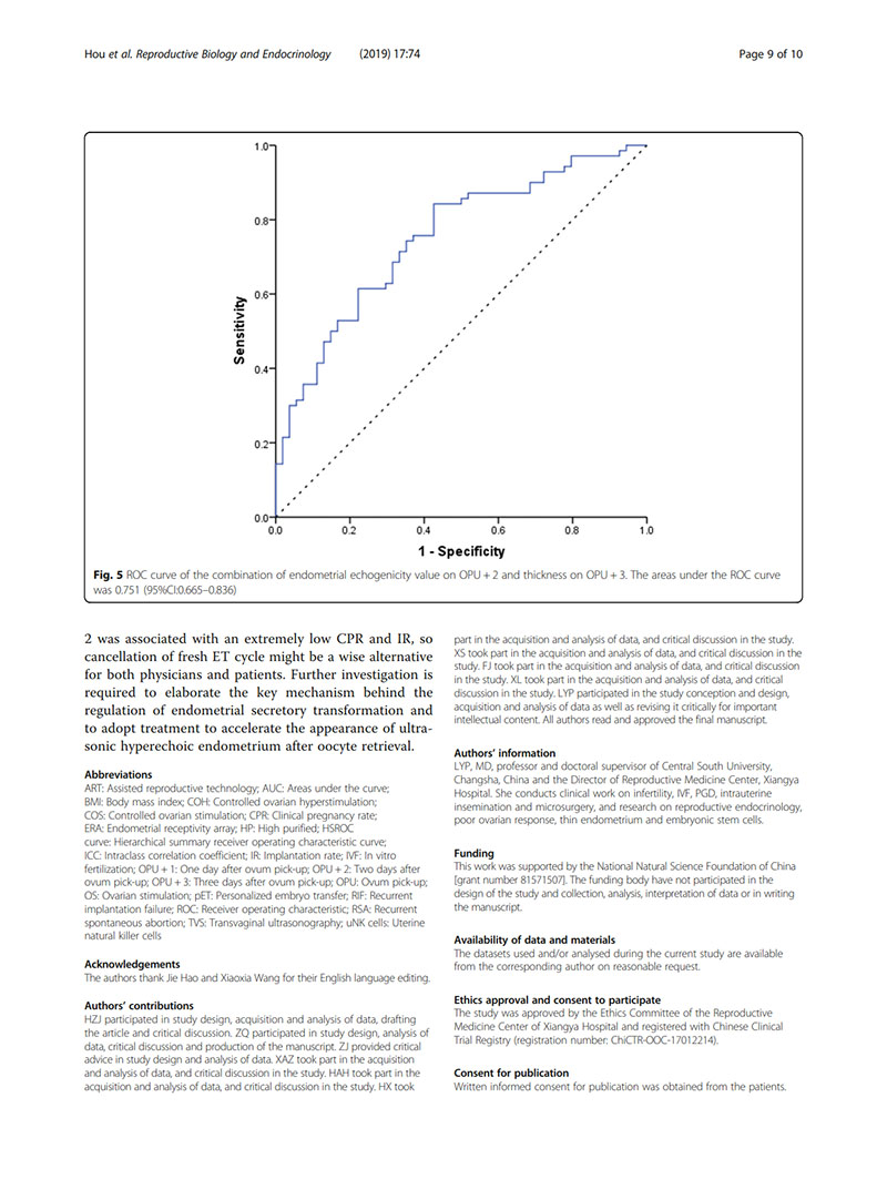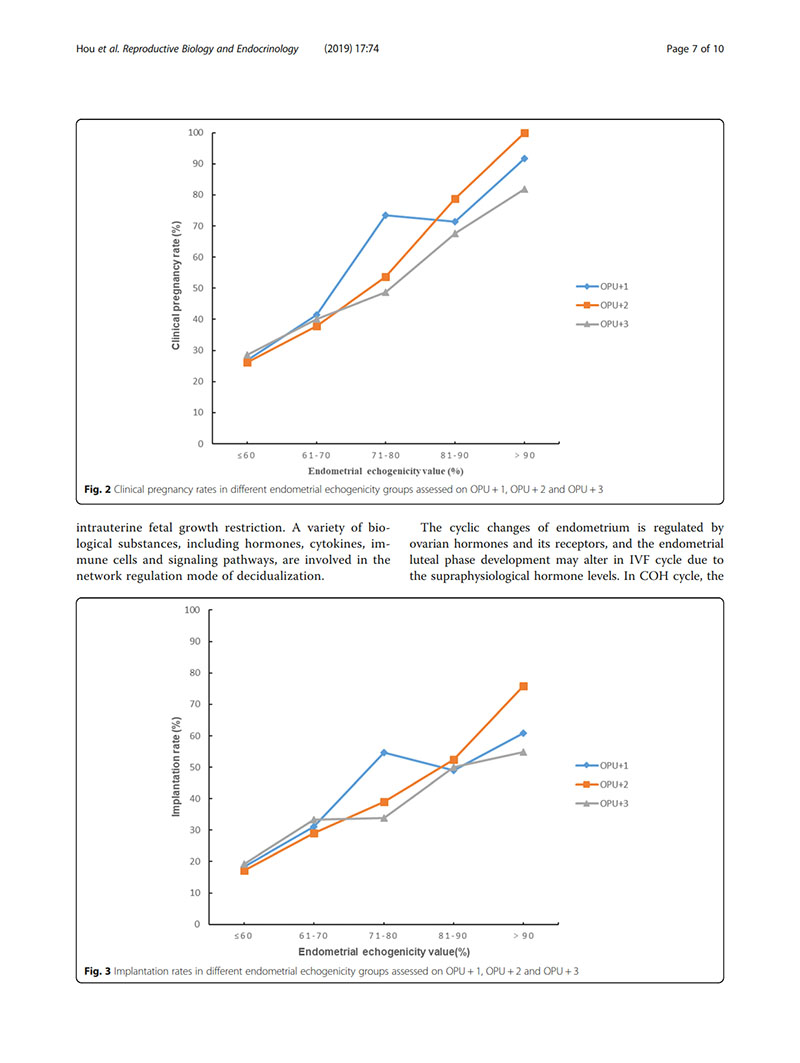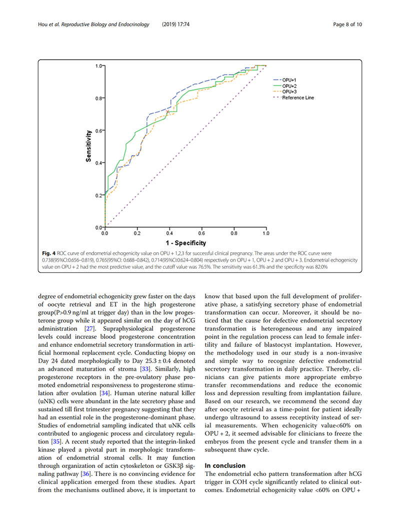 結論:建議用取卵后第2天(OPU+2)的子宮內膜回聲值評價子宮內膜容受性。當OPU+2的回聲值<60%時,臨床醫(yī)生似乎適合提供“全冷凍”IVF周期,并在隨后的凍融胚胎周期中進行移植。