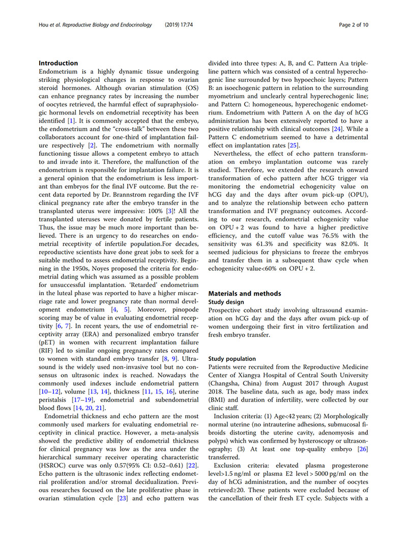 背景:非侵入性測量子宮內膜容受性的方法很有價值,因為它有可能改善體外受精(IVF)結局。有人認為hCG給藥當天的子宮內膜回聲是子宮內膜容受性的良好標志。在日常實踐中,我們注意到胚胎移植日子宮內膜非均質高回聲的患者通常妊娠率較低。因此,我們將延伸擴展了hCG觸發后子宮內膜回聲模式轉化的研究,以分析子宮內膜回聲改變與IVF結局之間的關系。