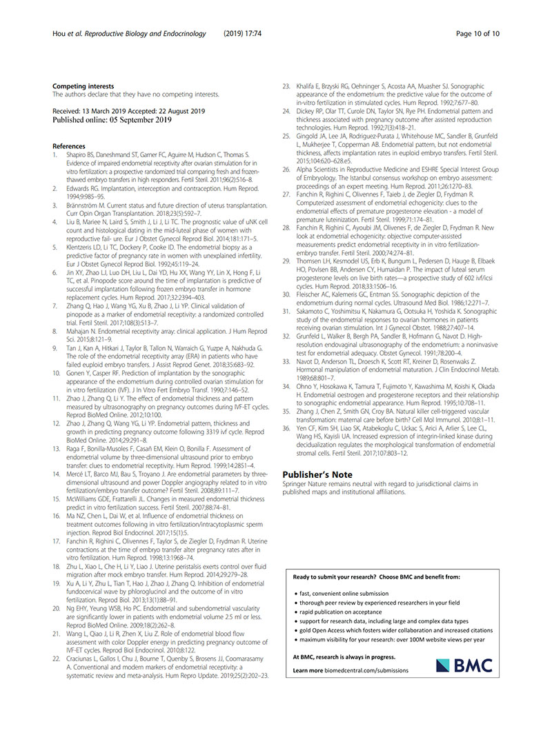 結論:建議用取卵后第2天(OPU+2)的子宮內膜回聲值評價子宮內膜容受性。當OPU+2的回聲值<60%時,臨床醫生似乎適合提供“全冷凍”IVF周期,并在隨后的凍融胚胎周期中進行移植。